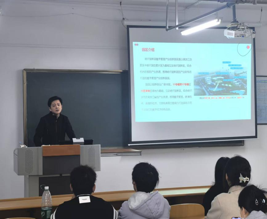 哈尔滨几米科技有限公司在本次宣讲会招聘直播电商、跨境电商两个岗位。招聘杨经理在宣讲中介绍了几米科技的企业文化、核心业务、工作环境、招聘要求及待遇等具体问题。招聘现场毕业生积极提问,杨经理耐心解答。33名学生提交应聘简历。