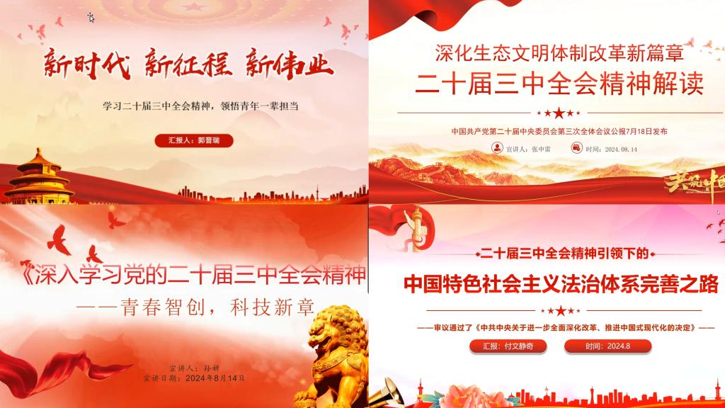 学生第一党支部郭晋瑞、孙妍,学生第二党支部张申雷、付文静奇等四名学生党员分别以《学习二十届三中全会精神,领悟青年一辈担当》、《深入学习党的二十届三中全会精神——青春智创,科技新章》、《深化生态文明体制改革新篇章——二十届三中全会精神解读》和《二十届三中全会精神引领下的中国特色社会主义法治体系完善之路》为题,从学生党员的职责、科技创新、生态文明等方面开展宣讲,以青年视角解读党的二十届三中全会精神,共同探讨在新时代新征程中,中国青年如何以新思想为引领,以新实践为动力,书写属于新一代的新华章,充分表达了青年一代的责任担当、勇于创新和为祖国奋斗的理想。