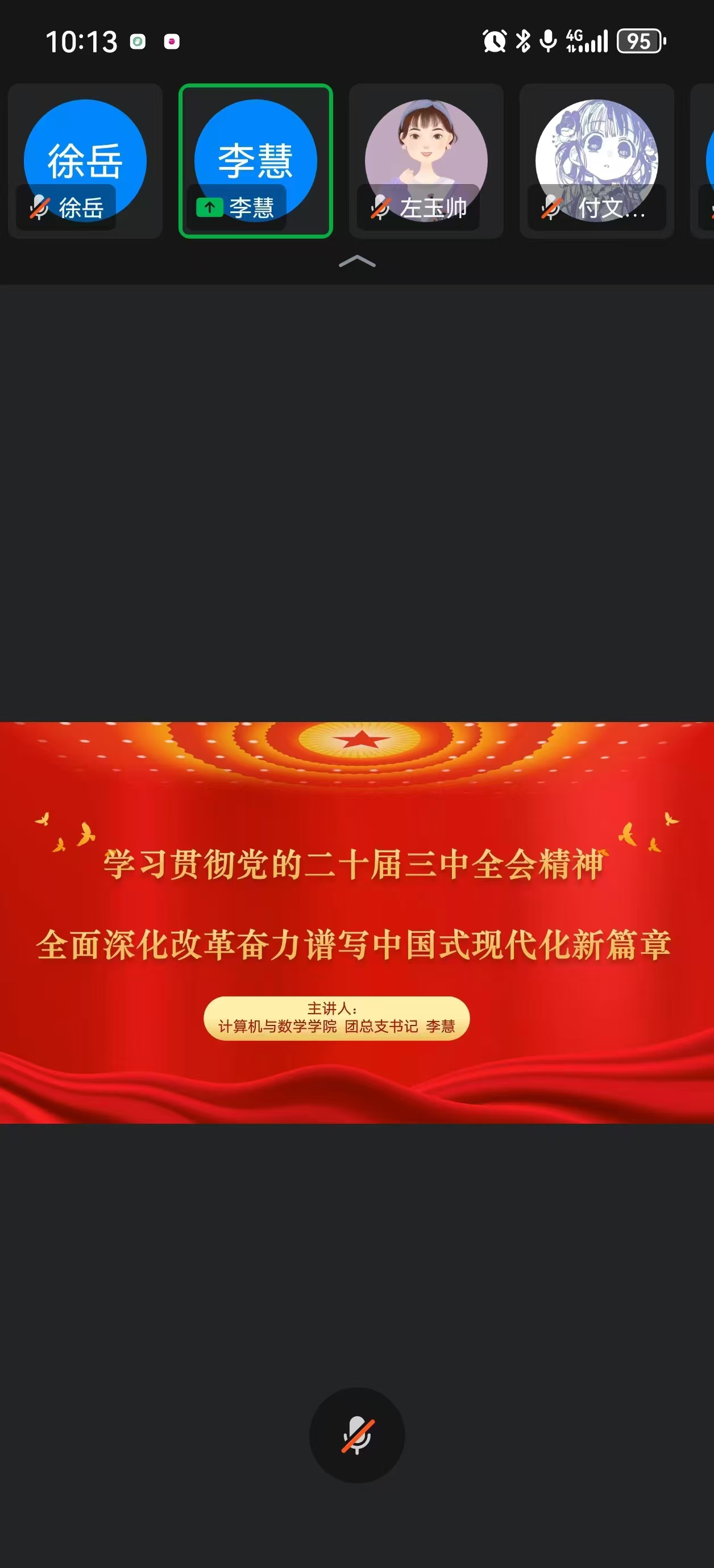 为深入学习贯彻党的二十届三中全会精神,引导广大青年学子准确领会把握全面深化改革的主题、重大原则、重大举措、根本保证。从全面深化改革的成功实践中汲取强大精神力量,2024年8月15日上午10点,计算机与数学学院团总支在线上开展了二十届三中全会精神专题学习。学院党总支副书记左玉帅、团总支书记李慧、2022级辅导员徐岳、团总支学生会全体学生干部参加了本次活动,会议由徐岳主持。