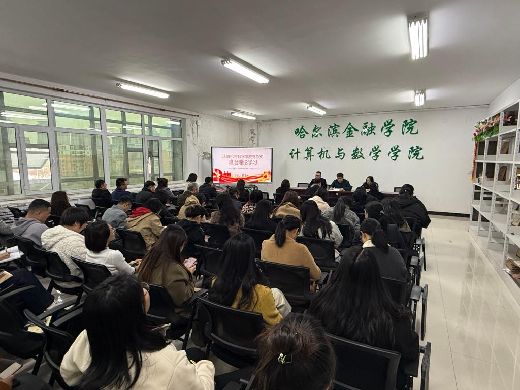 10月16日下午,计算机与数学学院在会计楼509室开展政治理论学习活动,深入学习习近平同志《论教育》,学习习近平总书记在全国民族团结进步表彰大会上的讲话,传达学习《中共黑龙江省委关于开展向“时代楷模”杨士莪同志学习活动的决定》,补学党的二十届三中全会精神和习近平在全国教育大会上的重要讲话精神。党总支书记王鹏主持会议,党总支书记王鹏、副院长许毅、副院长李俭分别领学有关内容,学院全体教职工参加会议。