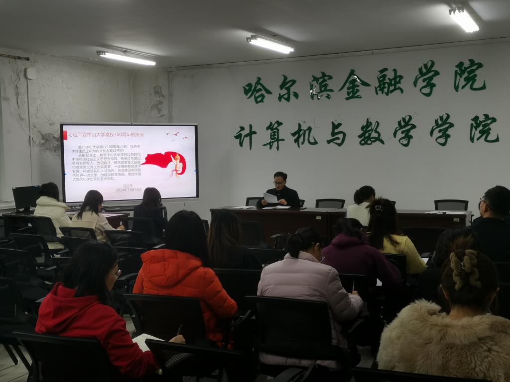 11月27日下午,计算机与数学学院在会计楼509室开展政治理论学习活动,传达学习习近平总书记致中山大学建校100周年的贺信,传达学习全省教育大会精神。学院党总支副书记、院长吴波主持会议,学院全体教职工参加会议。