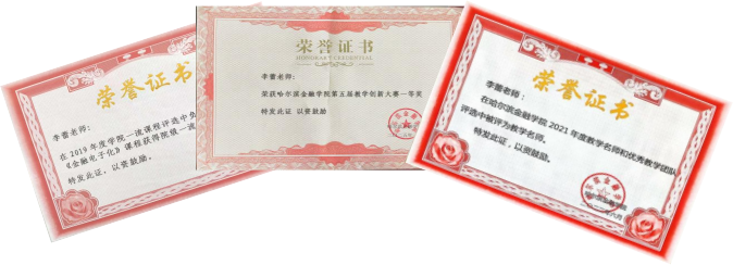 团队教师多次获得省级以上荣誉,2人分获省高校青年教师教学竞赛二等奖和优秀奖;作为主要参与人获得省级教学成果奖二等奖;1人获黑龙江省高校党支部书记素质能力大赛三等奖;获得黑龙江省优秀教育科研成果奖(高等教育类)二等奖1项;电子商务教研室党支部获黑龙江省公办高校党建“样板支部”创建单位。团队荣获校级师德先进集体荣誉称号。