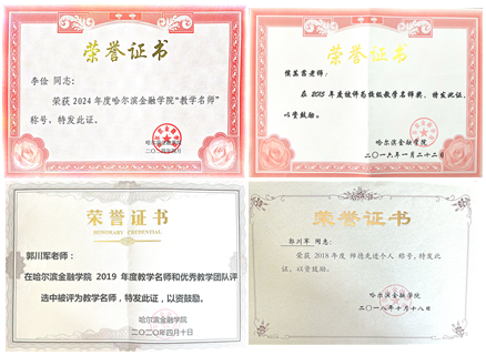 专业教师多次获得各级荣誉,目前拥有省级师德先进个人1人,校级教学名师3人,校级师德先进个人2人,校级优秀个人19人次,校级师德师风优秀个人9人次,优秀毕业论文指导教师13人次。1人荣获全国多媒体课件大赛高教工科组三等奖;1人获省教学创新大赛三等奖;2人荣获校首届微课大赛三等奖。1人获黑龙江省社会科学学科优秀科研成果一等奖;1人获黑龙江省高校人文社会科学研究优秀成果一等奖;1人获黑龙江省教育科学研究优秀成果一等奖;1人获黑龙江省科学技术三等奖;1人获校级优秀教学成果二等奖,2人获校级优秀教学成果优秀奖。