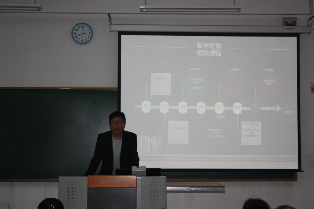 5月15日下午,计算机系在综合楼106开展了说课大赛展示活动。四位参赛教师精心准备了说课材料,每一位教师都细致地解说了自己对所授课程的理解,阐述自己的教学观点、教学设想、教学方法改革思路等。每一份精美的说课PPT都包括了教学背景分析、教学目标设计、教学内容设计、教学策略设计、考核方式设计、学习支持设计和教学设计表达等内容。每一门课程都将“以学生为中心”的理念落到了实处,处处体现了对学生学习过程和学习结果的关注。