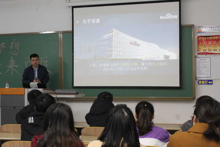 百度公司拥有国内最大的中文搜索引擎以及旗下众多子公司、控股公司。百度公司成立于2000年1月1日,多年来,百度一直秉承着“让人们最平等便捷地获取信息,找到所求”的发展理念,坚持着“用户至上”的服务策略,百度不断坚持技术创新,致力于为用户提供“简单可依赖”的互联网搜索产品及服务,其中包括:以网络搜索为主的功能性搜索;以贴吧为主的社区搜索,针对各区域、行业所需的垂直搜索;以及门户频道、IM等,全面覆盖了中文网络世界所有的搜索需求。根据第三方权威数据,在中国,百度PC端和移动端市场份额总量达73.5%,覆盖了中国97.5%的网民,拥有6亿用户,日均响应搜索60亿次。今天,百度已经成为中国最具价值的品牌之一。在2016年MIT Technology Review 《麻省理工科技评论》评选的全球最聪明50家公司中,百度的排名超越其他科技公司高踞第二。而“亚洲最受尊敬企业”、“全球最具创新力企业”、“中国互联网力量之星”等一系列荣誉称号的获得,也无一不向外界展示着百度成立数年来的成就。会议过程中首先由申经理对公司进行了简单的介绍,又对应聘条件和薪资待遇进行了讲解。本次招聘会一共有35位应届毕业生出席。大家都认真听取招聘会内容,为接下来的面试做好准备。会后,进入提问环节,大家就就业方向,工作转行,实习内容及地点展开提问。讲师一一为其解答。本次面试活动分为一、二两轮,分别进行了现场的1对1面试、远程连接北上广深的百度中心进行远程视频面试。在第一轮的面试环节中,我校通过了10人,进入到二轮面试中。