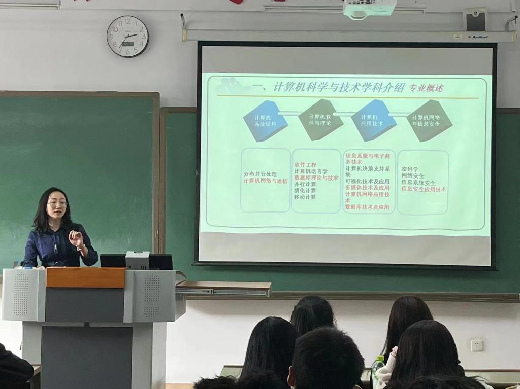 李俭老师分别从学科介绍、专业人才需求分析、专业人才培养定位及课程体系、专业课程的学习技术四个方面为该专业学生进行了专业详细讲解。李老师在介绍计算机科学与技术学科特点的基础上,通过数据分析和学生们一起了解了2023年人才需求情况及应届本科生的就业形势,重点解读了我院的办学特色和本专业人才培养方案中的课程设置情况,同时详细介绍了我系参加省级和国家级各项赛事取得的优异成绩及第五学期认知实习的情况,并引导了学生如何学好专业课程,最后又将导师制向学生作了简要的介绍。讲座后,李老师又分别与学生就一些学习方法、个人发展和竞赛等相关问题进行了探讨。