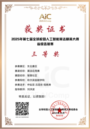2025年(第七届)全球校园人工智能算法精英大赛算法应用赛智慧社区赛道于2025年11月举行。我院刘明刚老师指导的张衡等同学的参赛作品获得了省级二等奖的成绩,刘洪波老师指导的仲如芸等同学的参赛作品获得省级三等奖的成绩。