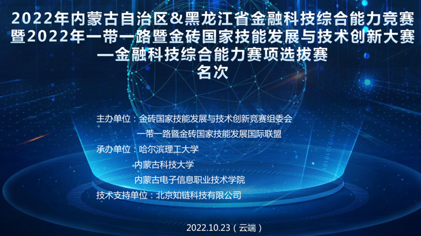 10月23日,2022年内蒙古自治区&黑龙江省金融科技综合能力竞赛暨2022年一带一路暨金砖国家技能发展与技术创新大赛——金融科技综合能力赛项选拔赛在云端举行,计算机系20级金融科技专业两支队伍代表我校参赛,经过3个小时的激烈角逐,史毅峰组获得黑龙江省赛区三等奖;周波组获得黑龙江省赛区二等奖,并获得晋级全国总决赛的名额。