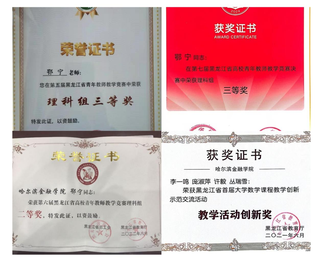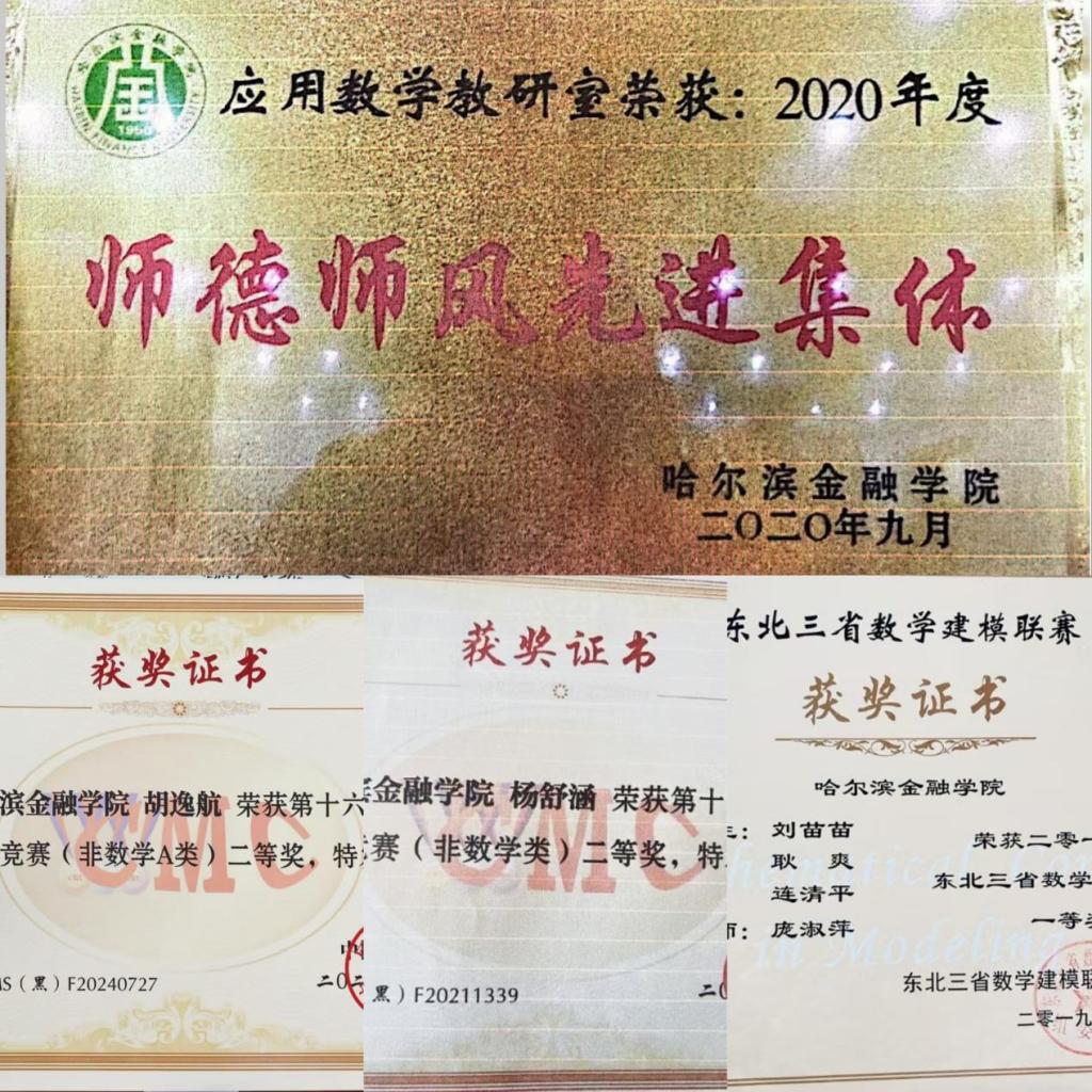 团队教师多次获得省级以上荣誉,1人获得省高校青年教师教学竞赛二等奖1次和三等奖2次;1人获黑龙江省首届大学数学课程教学活动创新奖;获得黑龙江省教育科学研究“十三五”期间优秀教育科研成果(高等教育类)二等奖1项;数学团队荣获校级优秀教学团队和校级师德先进集体荣誉称号。